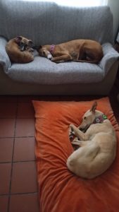A nossa galguinha Cookie já foi adotada. Agora chama-se Kuka e foi para a Marinha Grande para uma família com dois pinchers e já acostumados à raça pois já tiveram galgos.