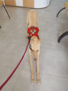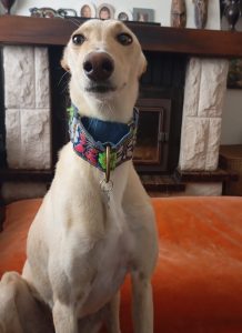 É uma galgo, muito alegre e bem disposta, adora andar de carro, anda bem à trela e procuramos adotantes com outros animais para lhe fazerem companhia, com espaço e tempo disponível para a passear e mimar.