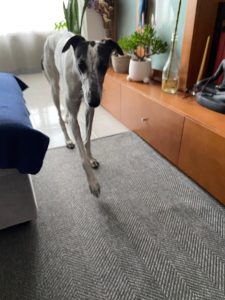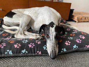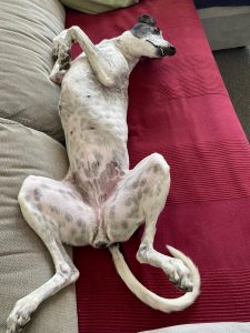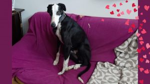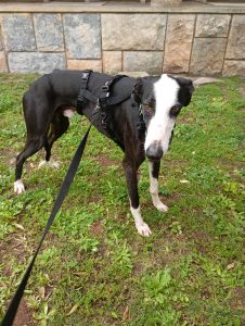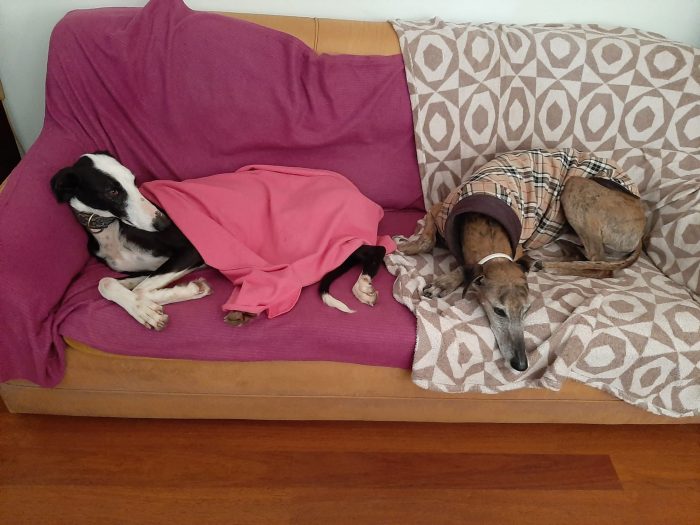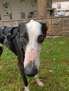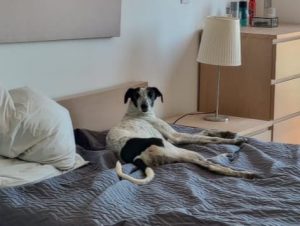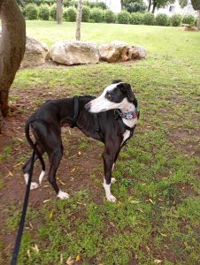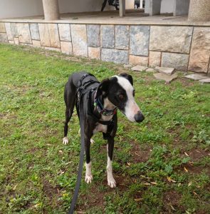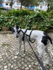 Posteriormente recebemos outra mana que constatamos ser da mesma ninhada, devido às enormes dificuldades comportamentais e de ansiedade, entregaram-nos a whippet para adoção, também já foi adotada pelo nosso adotante António que já nos tinha adotado o whippet Billy e greyhound Yudi.